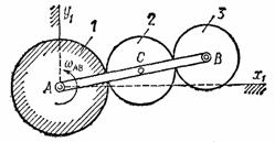 2. Планетарной называется передача (рис.62), в которой шестерня 1 неподвижна, а оси остальных шестерен, находящихся в последовательном зацеплении, укреплены на кривошипе АВ, вращающемся вокруг оси неподвижной шестерни.