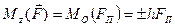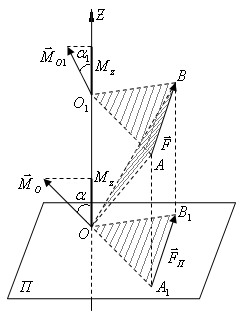 Моментом силы относительно оси называют алгебраический момент проекции этой силы на плоскость, перпендикулярную оси, относительно точки пересечения оси с этой плоскостью. Момент силы считается положительным, если проекция силы стремится вращать тело вокруг положительного направления оси против часовой стрелки, и отрицательным, если она стремится вращать тело по часовой стрелке. Момент силы, например, относительно оси Oz обозначим