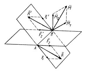 Эти пары сил можно получить из пар сил, как угодно расположенных в пересекающихся плоскостях, путем параллельного переноса, поворота в плоскости действия и одновременного изменения плеч и сил пар. Сложим силы в точках А и В по правилу параллелограмма. После сложения получим две силы