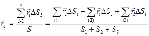 Полненная формула имеет ту же структуру, что и формула, определяющая радиус-вектор центра тяжести тела при разбиении его на элементарные частицы, только в нее входят величины для конечных частей тела.
