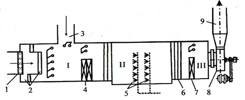 1 — заборный воздуховод; 2 — фильтр; 3 — соединительный воздуховод; 4 — калориферы первой и второй ступени подогрева; 5 — форсунки воздухоочистки; 6 — переходник-каплеуловитель; 7 — калориферы второй ступени; 8 — вентилятор; 9 — отводной воздуховод.