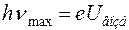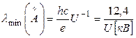 Для выбивания электрона с какого-либо энергетического уровня летящий к аноду электрон должен обладать достаточной кинетической энергией. Т.е., напряжение на трубке должно быть выше некоторой величины. Она должна быть, как минимум, равна разности энергии того уровня, с которого электрон выбит, и первого свободного от электронов уровня, на который выбитый электрон переходит. С другой стороны линия данной серии с наибольшей частотой возникает при последующем переходе электрона с самого верхнего уровня атома на освободившееся место во внутреннем уровне, т.е. должно выполниться равенство (6).