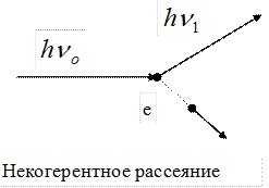 Х-квант взаимодействует с электронами разных оболочек. Внешние электроны слабо связаны и в первом приближении их можно рассматривать как свободные. В результате взаимодействия часть энергии кванта перейдет электрону, он вылетит из атома с определенной скоростью, а остаток энергии будет испущен в виде кванта с меньшей энергией, следовательно, и частотой. Т.е. наблюдается рассеяние с увеличением длины волны – некогерентное рассеяние. Некогерентное рассеяние – результат упругих столкновений Х-квантов со свободными электронами.