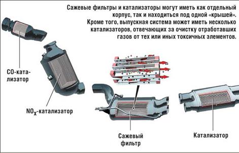 Сравнительно небольшое содержание вредных компонентов в отработавших газах дизелей не требовало в прошлом установки специальных устройств. Однако ужесточение норм токсичности (Евро-3 и Евро-4) коснулось и их. Основные претензии к дизелям экологи предъявляют из-за содержания частиц сажи и окиси азота (NOx) в выхлопе. Поэтому и на дизелях появились системы снижения токсичности выхлопа, включающие рециркуляцию отработавших газов, каталитический нейтрализатор и специальный сажевый фильтр.