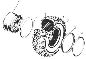 5 – обод колеса; 6 - замочное кольцо; 7 - покрышка