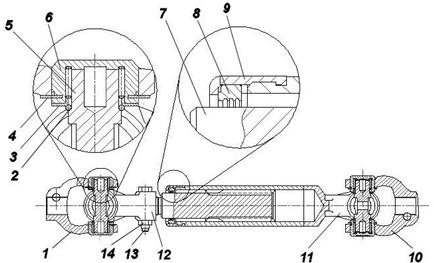 1, 10 – вилка; 2 – уплотнительное кольцо; 3 – обойма уплотнительного кольца; 4 – упорное кольцо; 5 – крестовина; 6 – игольчатый подшипник; 7 – шлицевой стержень; 8 – уплотнительное кольцо; 9 – обойма; 11 – вилка со шлицевой втулкой; 12 – вилка со шлицевым стержнем;13 – стяжной болт; 14 – гайка