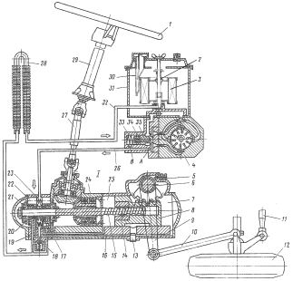1 – рулевое колесо; 2 – пружина предохранительного клапана фильтра; 3 – фильтр; 4 – масляный насос; 5 – перепускной клапан; 6 – вал сошки с зубчатым сектором; 7 – задняя полость силового цилиндра; 8 – поршень-рейка; 9 – сошка; 10 – продольная тяга; 11 – поперечная тяга; 12 – переднее колесо автомобиля; 13 – магнитная пробка; 14 – шариковая гайка; 15 – винт; 16 – картер рулевого механизма; 17 – обратный клапан; 18 – предохранительный клапан рулевого усилителя; 19 – распределитель; 20 – золотник; 21 – упорный подшипник; 22 – реактивный плунжер; 23 – центрирующая пружина; 24 – угловой редуктор; 25 – передняя полость силового цилиндра; 26 – линия нагнетания; 27 – карданный вал; 28 – радиатор; 29 – труба рулевой колонки; 30 – заливной фильтр; 31 – бачок насоса (гидросистемы); 32 – линия слива; 33 – пружина перепускного клапана насоса; 34 – предохранительный клапан насоса; 35 – перепускной клапан; А, Б – дросселирующие отверстия
