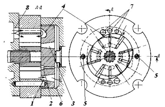 При дальнейшем вращении ротора происходит уменьшение объема между лопастями, что приводит к повышению давления масла, которое через нагнетательные каналы 1 в распределительном диске направляется в систему.