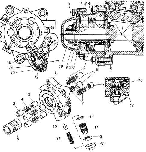 1 – передняя крышка; 2 – реактивный плунжер; 3 – корпус распределителя; 4, 7, 12 – пружины; 5 – упорный роликовый подшипник; 6 – плунжер глухого отверстия; 8 – золотник; 9 – тарельчатая пружина; 10 – гайка; 11 – регулировочный винт предохранительного клапана; 13 – контргайка; 14 – уплотнительное кольцо; 15 – предохранительный клапан; 16 – реактивный плунжер с обратным клапаном; 17 – обратный клапан; 18 – колпак регулировочного винта предохранительного клапана