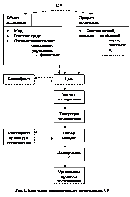 Системный анализ предполагает рассмотрение и исследования в их неразрывной связи с внешней средой и объектом управления (см. рис. 1 «Блок-схема диалектичного исследования»).