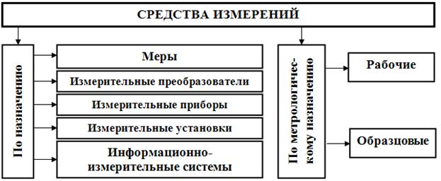 По назначению средства измерений разделяют на меры, измерительные преобразователи, измерительные приборы, измерительные установки и измерительные системы. По метрологическому назначению средства измерений делят на образцовые и рабочие.