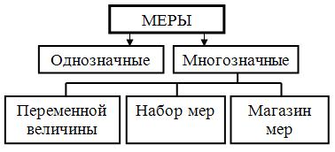 Существуют однозначные и многозначные (переменные) меры. Мера, воспроизводящая физическую величину одного размера, называется однозначной, например, гиря, плоскопараллельная концевая мера длины, измерительная колба, мера ЭДС. - нормальный элемент, конденсатор постоянной емкости. Величины, для которых операция сложения выполняется сравнительно легко, воспроизводятся с помощью многозначных или однозначных мер, объединяемых в наборы или магазины мер.