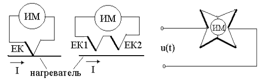 В некоторых случаях измерить электрическую величину непосредственно бывает невозможно. В этом случае одним из вариантов ее измерения является измерение тепловых проявлений, которые вызывает данная электрическая величина в проводнике. Некоторые схемы тепловых измерений представлены на рисунке: