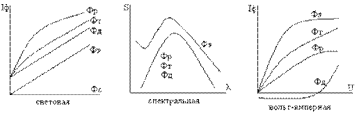 Внутренний фотоэффект – явление, происходящее внутри кристаллической решетки твердого тела при воздействии светового потока. При этом происходит изменение энергетического состояния носителей зарядов, приводящее к их концентрации и перераспределению внутри кристалла. Этот тип фотоэффекта характерен только для полупроводников и диэлектриков. Внешний фотоэффект состоит в эмиссии электронов под действием светового потока. Рассмотрим основные характеристики фотоэлектрических преобразователей – световую, спектральную и вольтамперную.