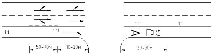 Для этого перед перекрёстком и за перекрёстком линию разметки 1.1 заменяют на линию 1.11 (плакат №54).