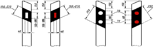 На сигнальных столбиках, имеющих скос верхней части, световозвращатели круглые и прямоугольные располагают в центре чёрной полосы.