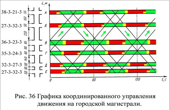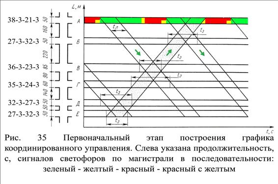 Слева от вертикальной оси с соблюдением масштаба наносят выполненный схематический план магистрали с указанием расстояний между перекрестками. Отмечают режимы светофорного регулирования.