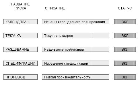Интересный пример подобной модели — система Riskology от Демарко и Листера, который иллюстрирует применение метода Монте-Карло для получения информации о том, какой запас времени будет необходим для того, чтобы преодолеть влияние всех неуправляемых рисков проекта, приведен в источнике [8]. Модель позволяет учесть пять основных (Рисунок 29) и пять дополнительных рисков проекта.