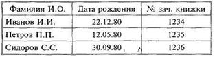 2. Выполняем проекцию полученных отношений, отбирая из каждого только атрибуты «Номер зачетной книжки» и «Фамилия студента». Получили новые списки отличников, в которых остались только номера зачетных книжек и фамилии студентов.