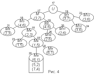 Множество U, содержащее все 720 гамильтоновых контуров нашего графа, разбито на три непересекающихся подмножества: M 1 = {контуры, не содержащие дуги (3,7)}, r(M 1 ) =19; M2 = {контуры, содержащие дугу (3,7) и не содержащие дугу (4,6)}, r(M 2 ) =19; M 3 = {контуры, содержащие дуги (3,7) и (4,6)}, r(M 3 ) =18 (рис. 4).