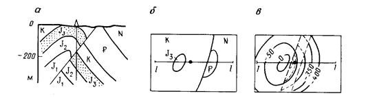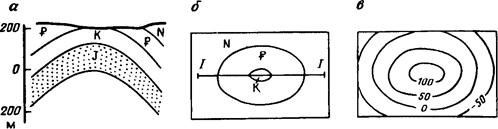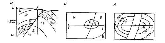 Антиклинальная складка. а - геологический разрез по линии /-/; б - геологическая карта; в - структурная карта по кровле юрского комплекса