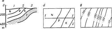 Сброс, осложняющий строение антиклинальной складки. а — геологический разрез по линии I — I, б — геологическая карта; в —структурная |