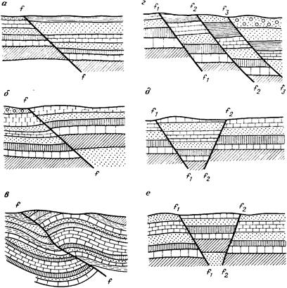 Формы дизъюнктивных дислокаций (геологические разрезы): а - сброс; б - взброс; в - надвиг; г - ступенчатые сбросы; д - грабен; е - горст; |