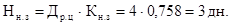 Норма оборотных средств на незавершенное производство Нн.з определяется умножением средней длительности производственного цикла (продолжительности ремонта) Др.ц на коэффициент нарастания затрат Кн.з., определяемый как частное от деления суммы единовременных материальных затрат (ремонтные материалы и запасные части) и половины всех остальных расходов на общую сумму затрат по ремонту объектов, продолжительность ремонта которых превышает одни сутки.