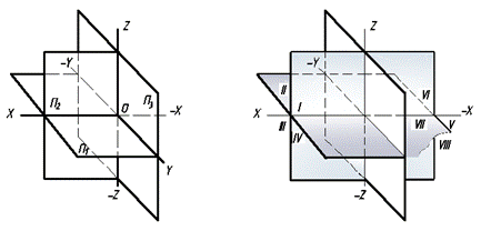 Условно принята правая система расположения координатных осей. Ось х направлена от начала координат влево, ось у – вперед (к наблюдателю), ось z – вверх. Обратные направления осей считаются отрицательными. Такую систему осей координат и плоскостей проекций называют декартовой системой, по имени французского ученого Р. Декарта (1596–1650), предложившего прямоугольную систему координат для определения положений точек в пространстве. Координатные плоскости, или плоскости проекций, имеют следующие названия: