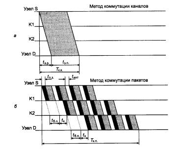 Рис. 2.31. Задержки передачи данных в сетях с коммутацией каналов и пакетов