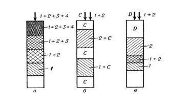 В зависимости от способа перемещения разделяемой смеси вдоль слоя сорбента различают следующие варианты хроматографии: фронтальный, проявительный и вытеснительный. При фронтальном варианте в слой сорбента непрерывно вводится разделяемая смесь, состоящая из газа-носителя и разделяемых компонентов, например 1, 2, 3, 4, которая сама является подвижной фазой. Через некоторое время после начала процесса наименее сорбируемый компонент (например, 1) опережает остальные и выходит в виде зоны чистого вещества раньше всех, а за ним в порядке сорбируемости последовательно располагаются зоны смесей компонентов: 1 + 2, 1 + 2 + 3, 1 + 2 + 3 + 4 (рис., a). При проявительном варианте через слой сорбента непрерывно проходит поток элюента и периодически в слой сорбента вводится разделяемая смесь веществ. Через определённое время происходит деление исходной смеси на чистые вещества, располагающиеся отдельными зонами на сорбенте, между которыми находятся зоны элюента (рис., б). При вытеснительном варианте в сорбент вводится разделяемая смесь, а затем поток газа-носителя, содержащего вытеснитель (элюент), при движении которого смесь через некоторый период времени разделится на зоны чистых веществ, между которыми окажутся зоны их смеси (рис., в). Хроматографы используют для анализа и для препаративного (в т. ч. промышленного) разделения смесей веществ. При анализе разделённые в колонке хроматографа вещества вместе с элюентом попадают через различные промежутки времени в установленное на выходе из хроматографической колонки детектирующее устройство, регистрирующее их концентрации во времени. Полученную в результате этого выходную кривую называют хроматограммой.
