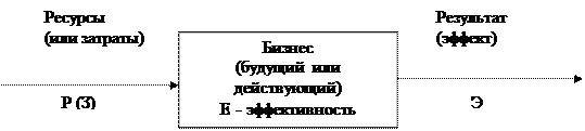 На рис. 6 эффективность (Е) выступает как внутренняя характеристика функционирования некой экономической системы (будущего или действующего бизнеса). В соответствии с определением, данным выше принципиально эффективность (Е) работы системы можно выразить математически как соотношение в виде «разности» (1) или «частного» (2) результатов и ресурсов (затрат):