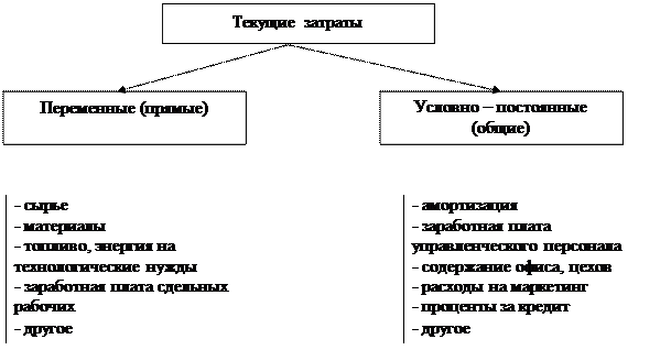Но при этом уже давно было отмечено, что часть текущих затрат изменяется прямо пропорционально изменяемым объема производства, а часть – (в некотором интервале) не изменяется вообще. Это приводит к тому, что с изменением объема производства и реализации продукции, например, их ростом, текущие затраты в целом растут медленнее объемов и себестоимости единицы продукции начинает снижаться. Состав текущих затрат с точки зрения деления их на переменные и условно – постоянные показан ниже.