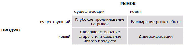 На пересечении полей «рынок» и «продукт» определяются четыре стратегии: