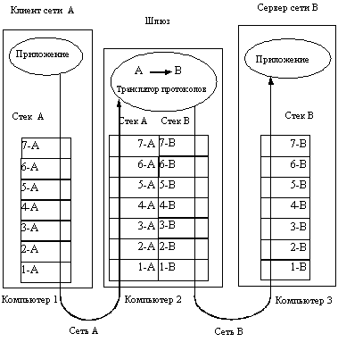 Рисунок 3.14 иллюстрирует принцип функционирования шлюза. В показанном примере шлюз, размещенный на компьютере 2, согласовывает протоколы клиентского компьютера 1 сети А с протоколами серверного компьютера 3 сети В. Допустим, что две сети используют полностью отличающиеся стеки протоколов. Как видно из рисунка, в шлюзе реализованы оба стека протоколов.