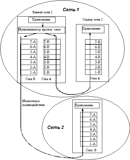 При мультиплексировании стеков протоколов на один из двух взаимодействующих компьютеров с различными стеками протоколов помещается коммуникационный стек другого компьютера. На рисунке 3.15 приведен пример взаимодействия клиентского компьютера сети 1 с сервером своей сети и сервером сети 2, работающей со стеком протоколов, полностью отличающимся от стека сети 1. В клиентском компьютере реализованы оба стека. Для того, чтобы запрос от прикладного процесса был правильно обработан и направлен через соответствующий стек, в компьютер необходимо добавить специальный программный элемент - мультиплексор протоколов. Мультиплексор должен уметь определять, к какой сети направляется запрос клиента. Для этого может использоваться служба имен сети, в которой отмечается принадлежность того или иного ресурса определенной сети с соответствующим стеком протоколов.