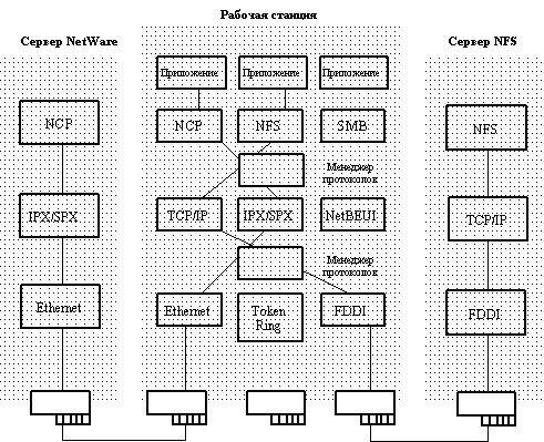 При использовании технологии мультиплексирования структура коммуникационных средств операционной системы может быть и более сложной. В общем случае на каждом уровне вместо одного протокола появляется целый набор протоколов, а мультиплексоров может быть несколько, выполняющих коммутацию между протоколами разных уровней (рисунок 3.16). Например, рабочая станция может получить доступ к сетям с протоколами NetBIOS, IP, IPX через один сетевой адаптер. Аналогично, сервер, поддерживающий прикладные протоколы NCP, SMB и NFS может без проблем выполнять запросы рабочих станций сетей NetWare, Windows NT и Sun одновременно.