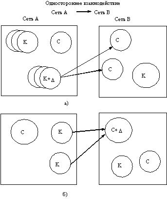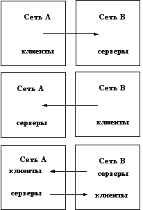- Все средства обеспечения взаимодействия расположены на стороне сети А. Все клиенты сети В могут обращаться к серверам сети А (не ко всем, а только к тем, которые имеют сетевую "добавку"). Часть клиентов сети А, которые обозначены как К+(, могут обращаться ко всем серверам сети В.