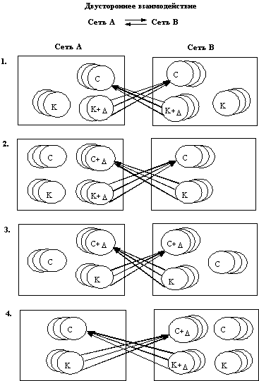 - Все средства межсетевого взаимодействия расположены на стороне В. Двусторонний характер взаимодействия обеспечивается модификацией и клиентских, и серверных частей сети В. Все клиенты сети А могут обращаться за сервисом к серверам сети В, обозначенным как С+(, а все серверы сети А могут обслуживать клиентов сети В, обозначенных как К+(.
