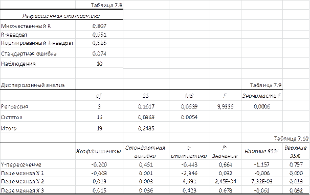 На первом этапе включим в модель все факторы. В качестве программного средства реализации анализа воспользуемся программой «Анализ данных в EXEL», инструмент «Регрессия». Результаты представлены в табл. 7.8, 7.9 и 7.10.