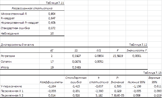 Из данных табл. 7.13 следует, что коэффициенты регрессии