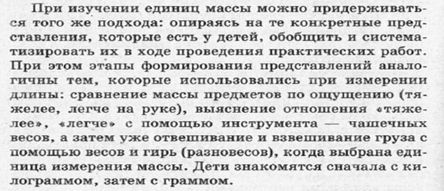 Единицы массы килограмм, грамм изучаются экспериментально-практическим методом. Учитель и учащиеся работают на демонстрационных весах, выполняют задания учебника на взвешивание и записывают результаты. После ознакомления с гирями в 1 кг, 2 кг, 5 кг с учащимися полезно рассматривать случаи: как взвесить предмет весом 3 кг, 6 кг, 7 кг и т.п. Полезно определять массу предметов, которые широко встречаются в быту: буханка хлеба, литр молока, ведро картошки и др.