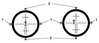 1 - горизонтальные, 2 - вертикальные исправительные винты.