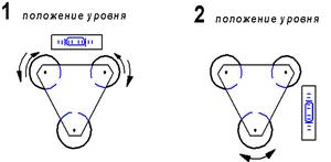 Одновременным вращением этих винтов в противоположных направлениях привести пузырёк уровня в нуль-пункт. Повернуть алидаду на 90° и вращением третьего подъёмного винта вновь