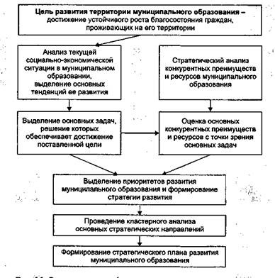 Проведение анализа преимуществ территории позволяет осуществить комплексный подход к оценке возможностей территории и предложить наиболее конкурентоспособные направления развития. Любая задача, сформулированная в ходе анализа текущей социально-экономической ситуации, может быть решена различными способами и при опоре на различные преимущества территории. Поэтому вслед за выделением конкурентных преимуществ территории необходимо проанализировать, какие из них могут быть использованы для решения задач, сформулированных на предыдущем этапе, т.е. при анализе текущей социально-экономической ситуации и определении основных тенденций развития территории. В приведенной ниже схеме показаны основные этапы формирования стратегического плана развития муниципального образования.
