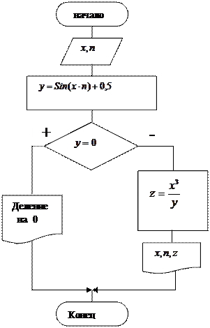 На первый взгляд можно составить линейную структуру. Но при равенстве знаменателя нулю функция не определена. Необходимо предусмотреть этот случай и в качестве результата в этом случае выдать информацию о том, что знаменатель функции равен нулю. Таким образом, в блок - схеме должно быть две ветви: 1 ветвь - знаменатель не равен нулю и можно вычислить и напечатать значение функции; 2 ветвь - знаменатель равен нулю и нужно выдать информацию о невозможности вычислить значение функции.