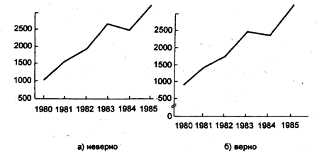 При графическом изображении динамики по оси абсцисс показывается время (годы, кварталы, месяцы); по оси ординат - значения показателей или показателя. При этом ось ординат должна иметь начало в точке «нуль». Иногда вместо нулевой точки в качестве начального уровня на оси ординат показывается уровень какого-либо года. Это делается в том случае, если изменения изображаемого показателя значительны - в 8-10 и более раз в течение рассматриваемого отрезка времени. Однако такой прием не рекомендуется. Правильнее указать нулевую точку, а затем (если нужно) «разорвать» ось ординат так, как это показано на рис. 3, б.