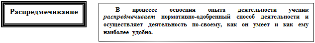 Иначе говоря, распредмечивание превращает опыт в индивидуальный способ деятельности ученика, обусловленный индивидуально-своеобразным характером учета объективных и субъективных условий деятельности.