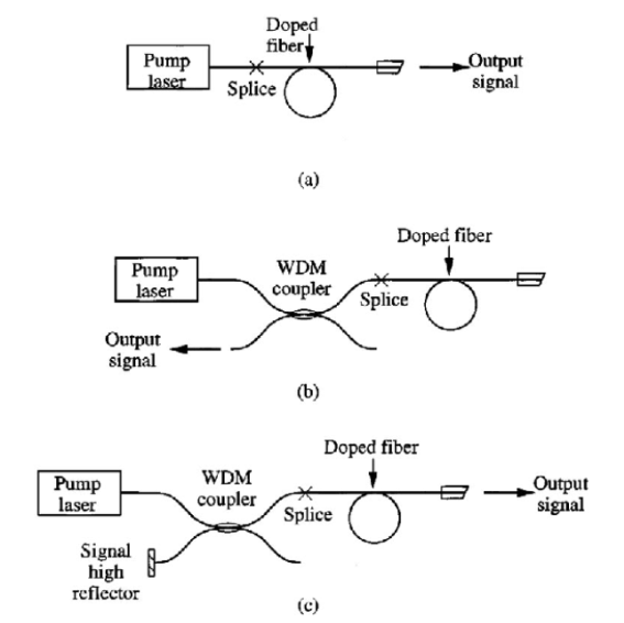 Рис.12. 1. Оптические схемы нескольких вариантов СВИС: a) сонаправленный с накачкой вывод излучения; б) вывод излучения во встречном направлении; с) двухпроходная схема.
