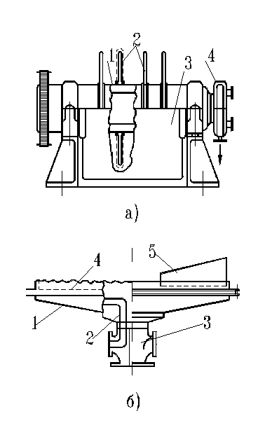 а) дисковые: 1- полый вал; 2- диски; 3- ванна; 4-распределительная головка; б) тарельчатый фильтр; 1- горизонтальный пустотелый диск; 2- трубки для слива фильтрата; 3- распределительная головка; 4- фильтрующая ткань; 5-нож.